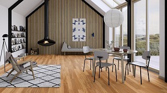 Норвежская компания разработала напольное покрытие, с помощью которого можно выполнять отделку пола в помещениях любых размеров и формы. В каталоге представлены размеры от 470х70 до 2750х300 мм. Главная же особенность данного материала заключается в технологии производства, которая заключается в: